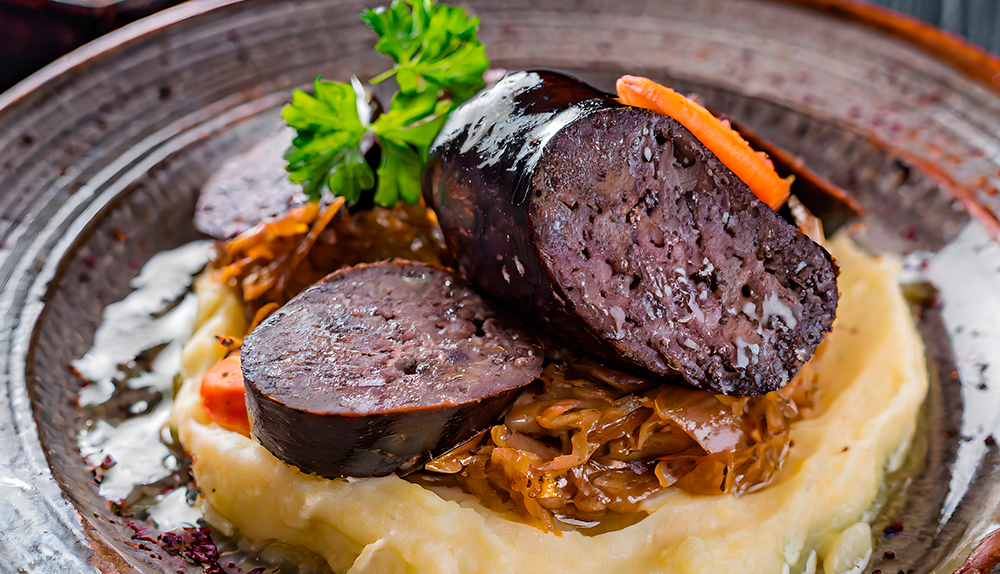 Morcilla con cebolla caramelizada y piñones