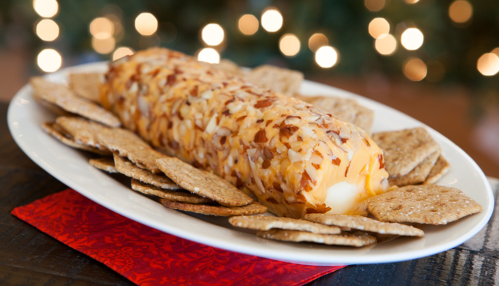 Rollo de queso con nueces, pistachos, arándanos y pasas